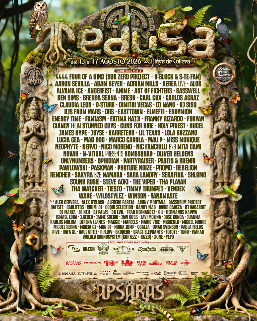 En cuanto a algunos detalles de la producción destacar los ocho escenarios diferentes con los que contará Medusa y su temática principal elegida en esta edición de 2026, Apsaras - un viaje imaginario al universo de la mitología hindú y budista - y donde la programación se completará con un día de preparty (13 de agosto), tres días de festival (14 al 16 de agosto) y aquellos que se alojen en las diferentes modalidades de camping podrán abandonarlo durante el día posterior a su finalización (17 de agosto).