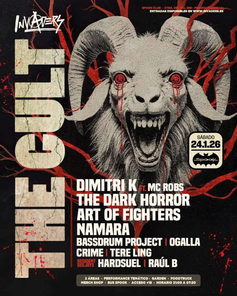 El 24 de enero llega la oscuridad y el caos con la primera INVADERS del año con THE CULT. Diez horas de absoluta locura bajo la mirada de la Bestia que pondrán a prueba tu fe. Para completar el sacrificio han creado la mezcla perfecta de sonidos, artistas y performances que te harán vivir una experiencia sobrenatural. Y quién mejor para acompañarnos en este viaje electrónico que artistas de la categoría de Dimitri K, MC Robs, The Dark Horror, Art Of Fighters, Namara, Bassdrum Project, Ogalla, Crime, Tere Ling, Hardsuel y Raul B.