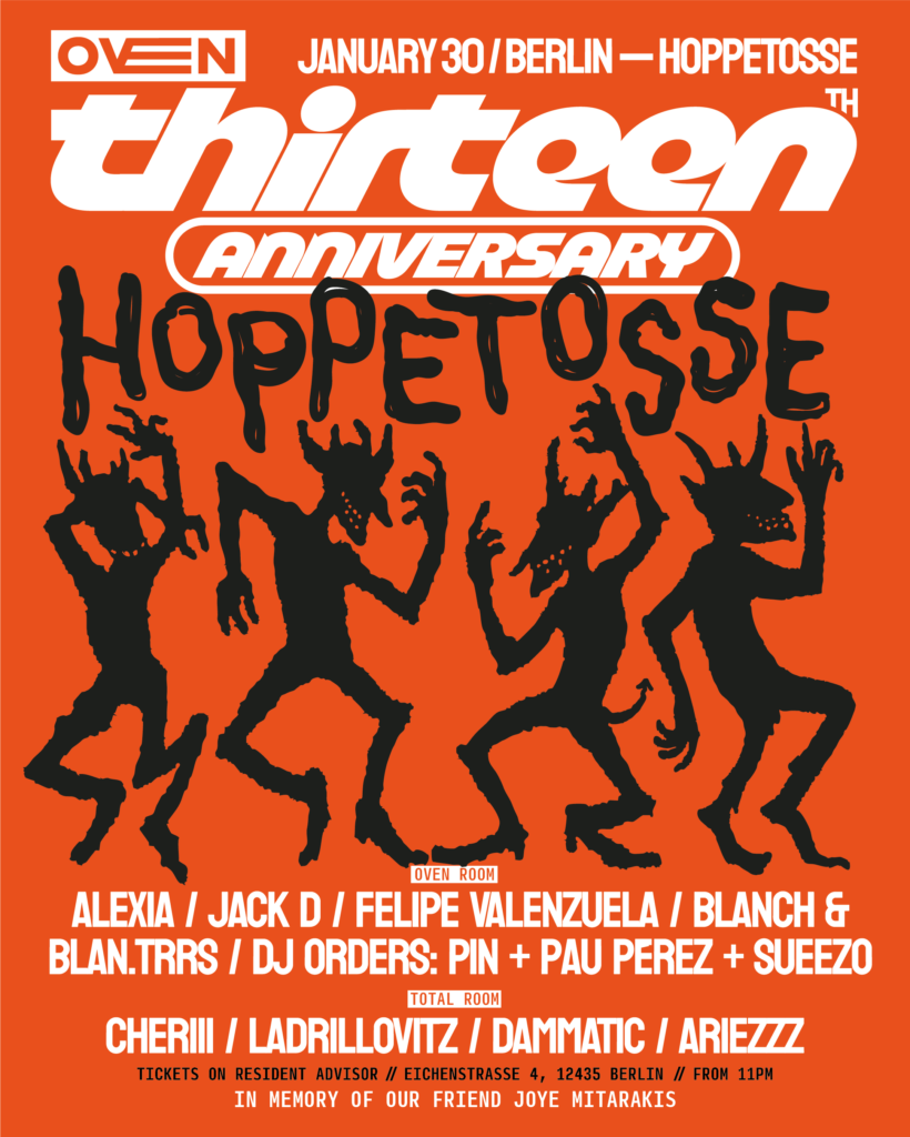 Pero esto no acaba aquí, traspasará fronteras, ya que el aniversario también nos llevará hasta Berlín el 30 de enero, a Hoppetosse, para una noche muy especial junto a artistas y amigos de la casa. Será una fecha para celebrar todo lo que nos une: la música, el baile y la familia que se ha formado alrededor de Oven. El line up estará formado por Jack D, Alexia , Felipe Valenzuela, Pin, Pau Pérez, Sueezo, Blanch, Blan.trrs, Ariezzz , Dammatic, Ladrillovitz y Cheriii.